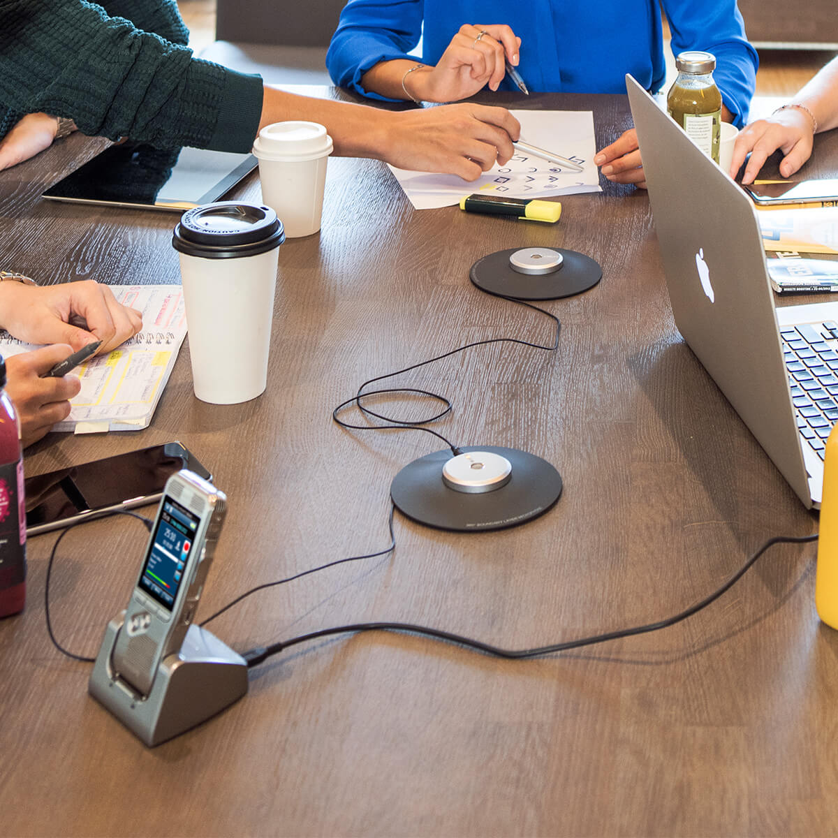 Erweitern Sie den Aufnahmebereich Ihres Pocket Memo Meeting-Recorders ganz einfach, indem Sie bis zu sechs Meeting-Mikrofone miteinander verbinden. So stellen Sie sicher, dass auch in großen Räumen und bei größeren Gruppen jede Stimme perfekt erfasst wird.